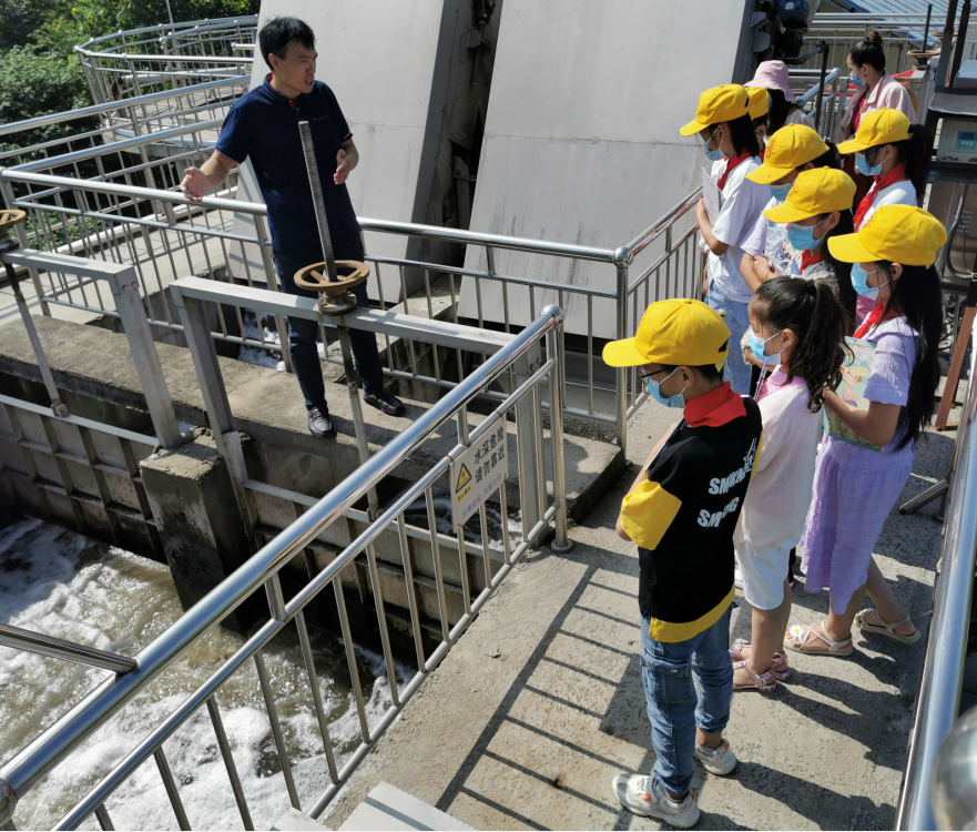 參觀前新中洲一廠副廠長(zhǎng)李廣輝給老師和同學(xué)們分享了污水的來(lái)源,讓大家對(duì)污水有一個(gè)正面的認(rèn)知。李廠長(zhǎng)先后帶領(lǐng)大家參觀了粗格柵、細(xì)格柵、生化池、加藥間、二沉池、纖維轉(zhuǎn)盤(pán)等設(shè)施,并對(duì)整個(gè)處理流程用簡(jiǎn)要易懂的語(yǔ)句給大家進(jìn)行了講解。當(dāng)講到粗格柵的作用是打撈大量的垃圾時(shí),又特別為大家講解從小養(yǎng)成不亂扔垃圾、垃圾分類(lèi)處理的好習(xí)慣,從而減少污染。走到生化池好氧段,大家看到又臟又臭的泥水,李廠長(zhǎng)耐心地告訴大家這些泥水里有著污水處理中需要各種微生物,它們是通過(guò)我們的鼓風(fēng)機(jī)及曝氣系統(tǒng)給它們供氧保證它們的活性,來(lái)吃掉那些污染物。更讓孩子們驚訝是二沉池的作用,剛剛還是泥水混合在一起,一瞬間又變成了清水。通過(guò)李廠長(zhǎng)的耐心講解孩子們聽(tīng)得津津有味,李廠長(zhǎng)用量筒取了出水水樣讓孩子們更直觀看到了污水是怎樣變成一汪清水的過(guò)程。